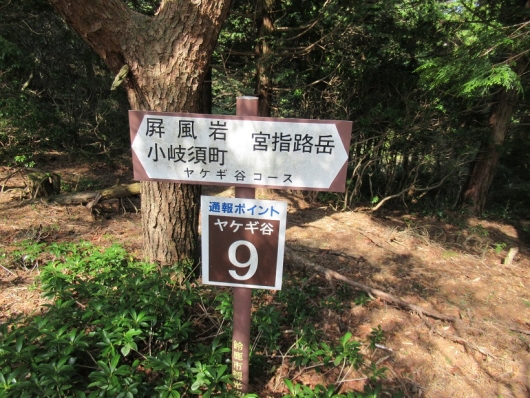 下山コースは山頂標識にある「ヤケギ谷コース」を選びましょう。